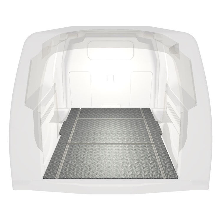 Lightweight and robust van floor with transverse rails for a Berlingo/Partner/Combo 19- with anti-slip aluminum tread plate and cargo rails (longitudinal and transverse) for quick and safe installation of racking systems and other accessories.