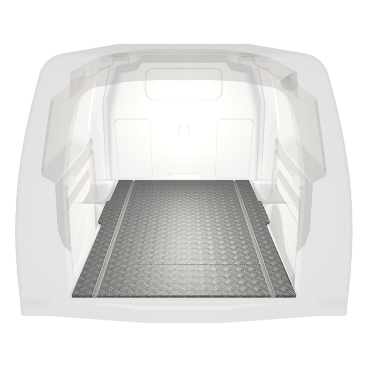 Lightweight and robust extra long floor for a Berlingo/Partner/Combo 19- with anti-slip aluminum tread plate and cargo rails (longitudinal) for quick and safe installation of racking systems and other accessories.