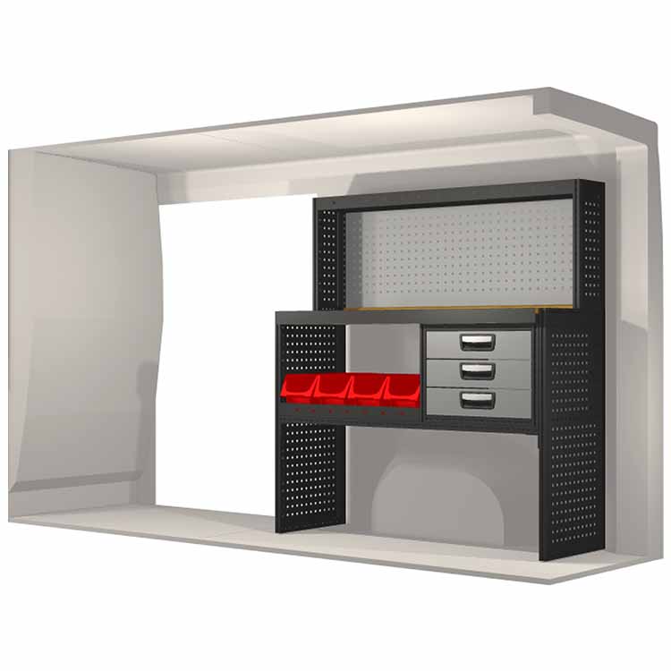 The racking has been specially designed to ensure the optimum fit to the vehicle, as well as the best possible functionality and safety. It has been developed for professional use, is flexible and is intended for service jobs in various types of business. All shelves are equipped with rubber mats, and all drawers with foam plastic liners. Assembly material is included.