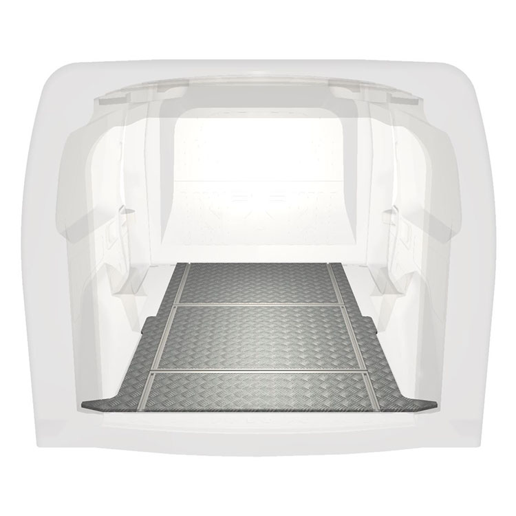 Lightweight and robust van floor with transverse rails for a Opel Combo / Fiat Doblò with anti-slip aluminum tread plate and cargo rails (longitudinal and transverse) for quick and safe installation of racking systems and other accessories.