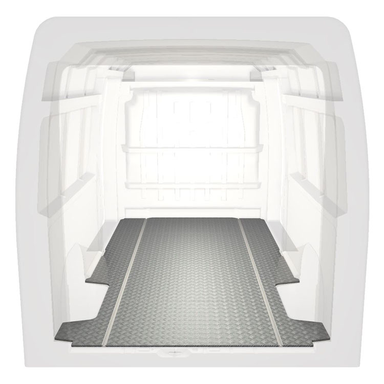 Lightweight and robust standard van floor for a Citroën Jumper / Peugeot Boxer / Fiat Ducato with anti-slip aluminum tread plate and cargo rails (longitudinal) for quick and safe installation of racking systems and other accessories.