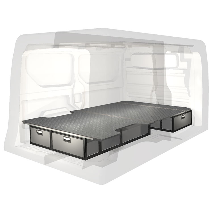 The kit is designed to be fitted on top of a wooden floor. The double floor is equipped with rails for easy installation of vehicle racking, and edging strips for a nice finish.