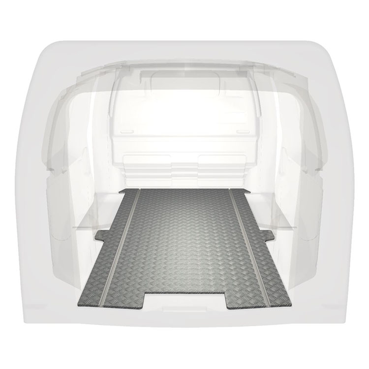 Lightweight and robust extra long floor for a Citroën Jumpy / Peugeot Expert / Toyota ProAce with anti-slip aluminum tread plate and cargo rails (longitudinal) for quick and safe installation of racking systems and other accessories.