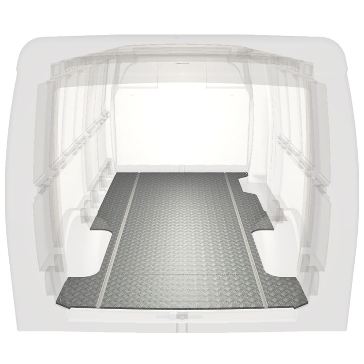 Lightweight and robust standard van floor for a Iveco Daily with anti-slip aluminum tread plate and cargo rails (longitudinal) for quick and safe installation of racking systems and other accessories.