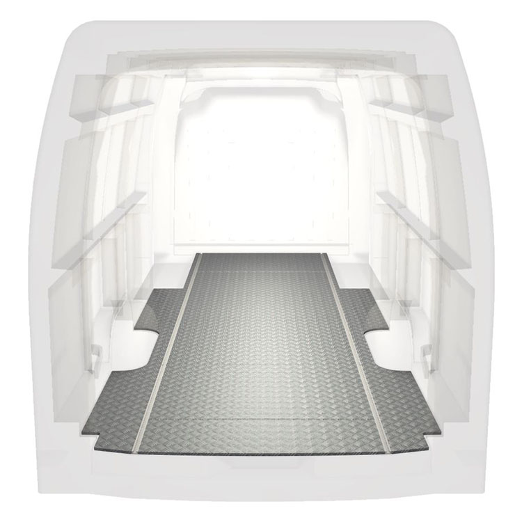 Lightweight and robust standard van floor for a Renault Master / Opel Movano / Nissan NV400 with anti-slip aluminum tread plate and cargo rails (longitudinal) for quick and safe installation of racking systems and other accessories.