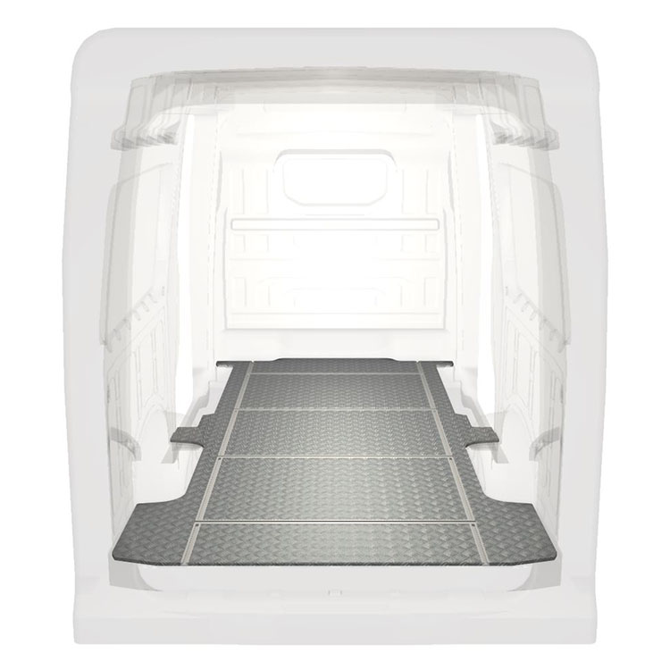 Lightweight and robust van floor with transverse rails for a Volkswagen Crafter / MAN TGE with anti-slip aluminum tread plate and cargo rails (longitudinal and transverse) for quick and safe installation of racking systems and other accessories.