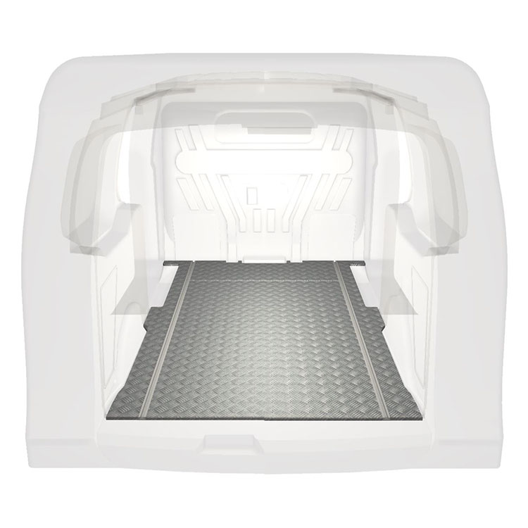 Lightweight and robust extra long floor for a Ford Transit Connect with anti-slip aluminum tread plate and cargo rails (longitudinal) for quick and safe installation of racking systems and other accessories.