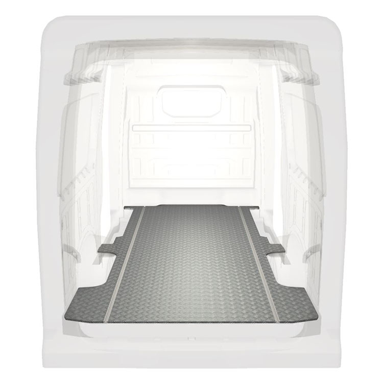 Lightweight and robust extra long floor for a Volkswagen Crafter / MAN TGE with anti-slip aluminum tread plate and cargo rails (longitudinal) for quick and safe installation of racking systems and other accessories.