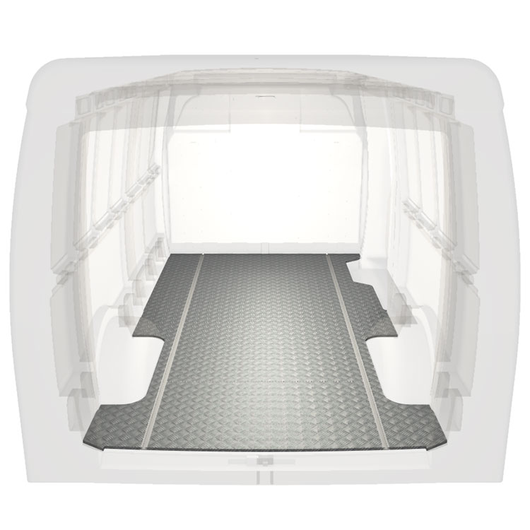 Lightweight and robust extra long floor for a Iveco Daily with anti-slip aluminum tread plate and cargo rails (longitudinal) for quick and safe installation of racking systems and other accessories.
