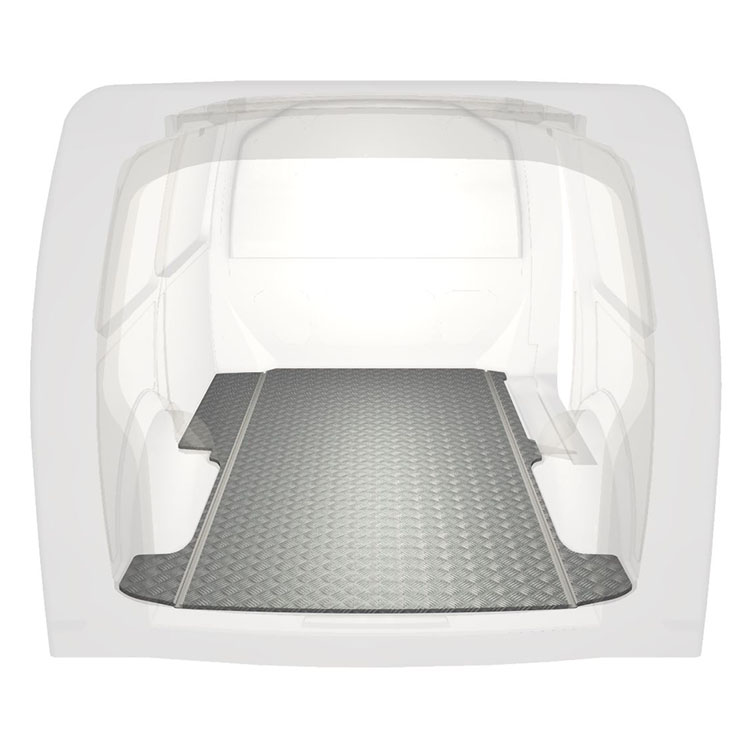 Lightweight and robust extra long floor for a Volkswagen Transporter T6 with anti-slip aluminum tread plate and cargo rails (longitudinal) for quick and safe installation of racking systems and other accessories.
