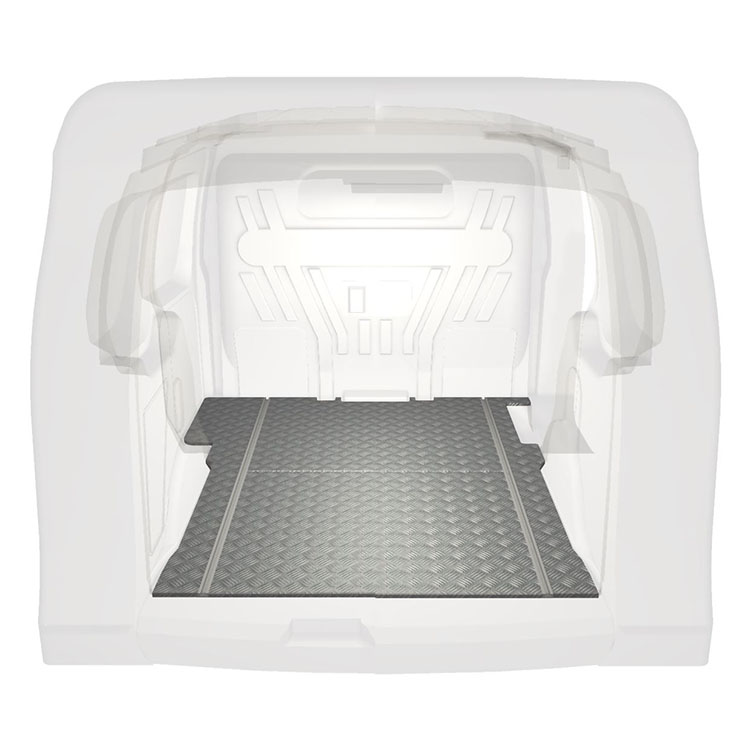 Lightweight and robust standard van floor for a Ford Transit Connect with anti-slip aluminum tread plate and cargo rails (longitudinal) for quick and safe installation of racking systems and other accessories.