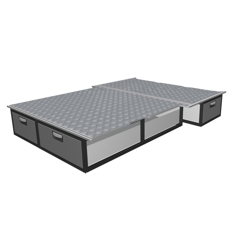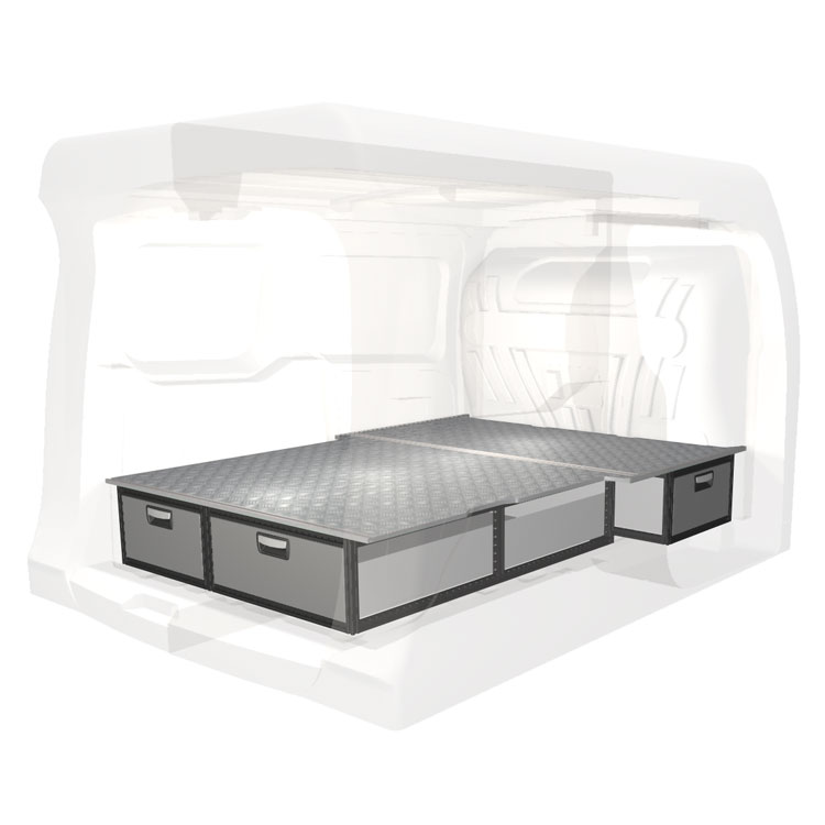 The kit is designed to be fitted on top of a wooden floor. The double floor is equipped with rails for easy installation of vehicle racking, and edging strips for a nice finish.