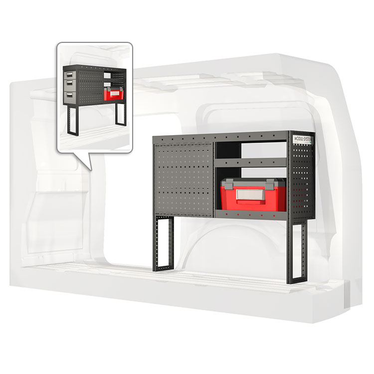 The racking has been specially designed to ensure the optimum fit to the vehicle, as well as the best possible functionality and safety. It has been developed for professional use, is flexible and is intended for service jobs in various types of business. All shelves are equipped with rubber mats, and all drawers with foam plastic liners. Assembly material is included.