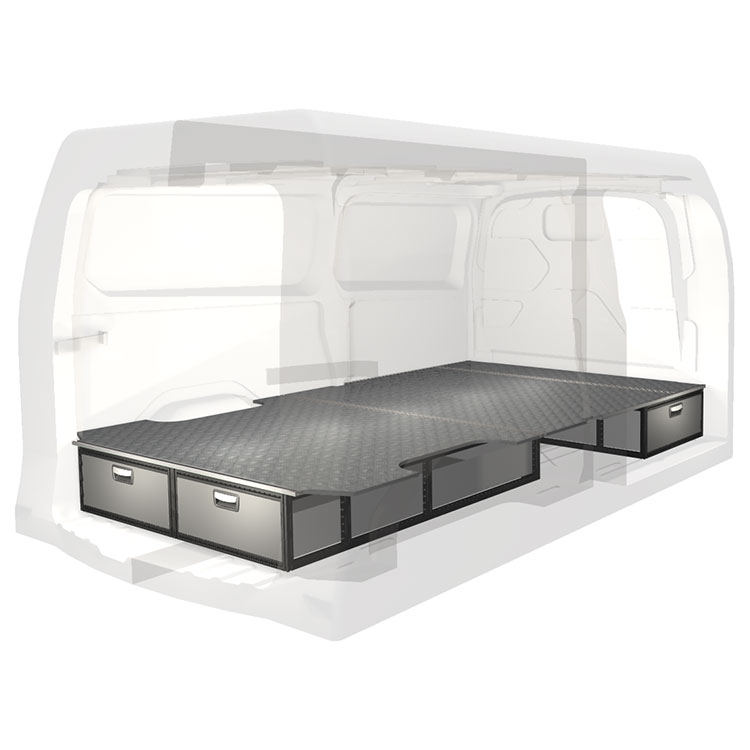 The kit is designed to be fitted on top of a wooden floor. The double floor is equipped with rails for easy installation of vehicle racking, and edging strips for a nice finish.
