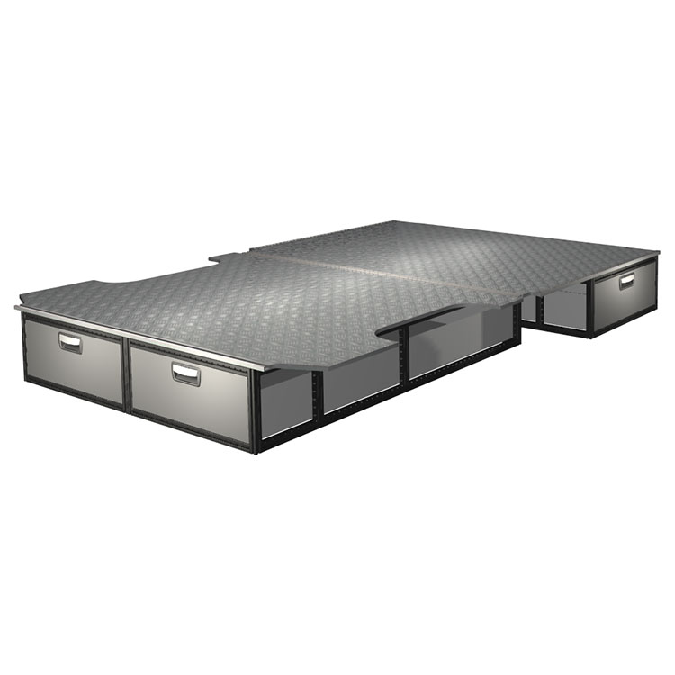 The kit is designed to be fitted on top of a Modul-Floor, utilizing the floor rails for a non-intrusive installation. The double floor is equipped with rails for easy installation of vehicle racking, and edging strips for a nice finish.
