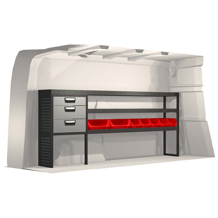 The racking has been specially designed to ensure the optimum fit to the vehicle, as well as the best possible functionality and safety. It has been developed for professional use, is flexible and is intended for service jobs in various types of business. All shelves are equipped with rubber mats, and all drawers with foam plastic liners. Assembly material is included.