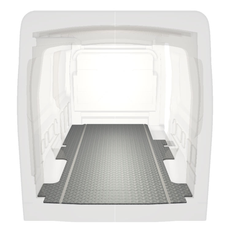 Lightweight and robust extra long floor for a Ford Transit with anti-slip aluminum tread plate and cargo rails (longitudinal) for quick and safe installation of racking systems and other accessories.