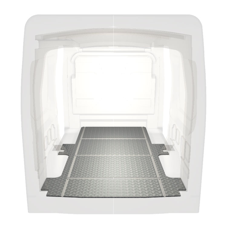 Lightweight and robust van floor with transverse rails for a Ford Transit with anti-slip aluminum tread plate and cargo rails (longitudinal and transverse) for quick and safe installation of racking systems and other accessories.