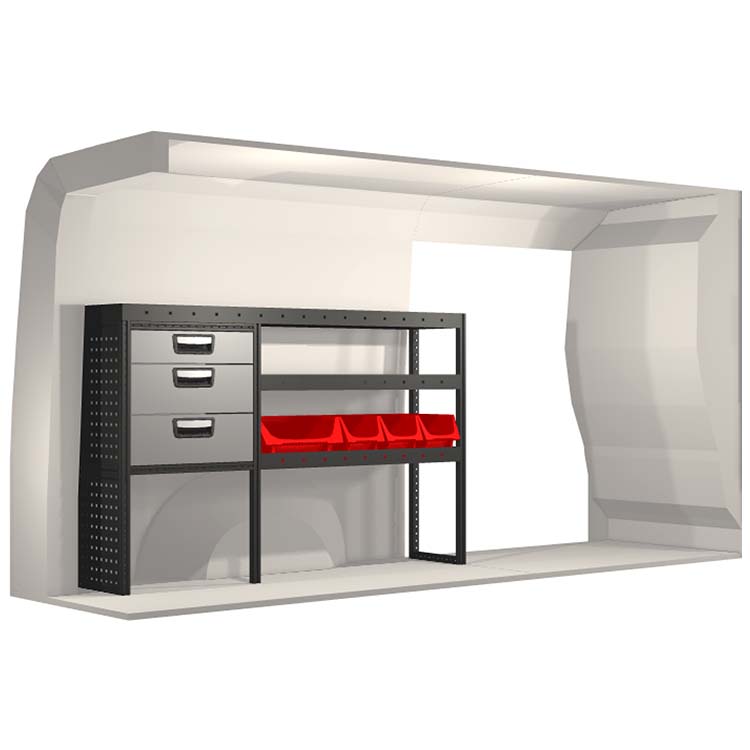 The racking has been specially designed to ensure the optimum fit to the vehicle, as well as the best possible functionality and safety. It has been developed for professional use, is flexible and is intended for service jobs in various types of business. All shelves are equipped with rubber mats, and all drawers with foam plastic liners. Assembly material is included.