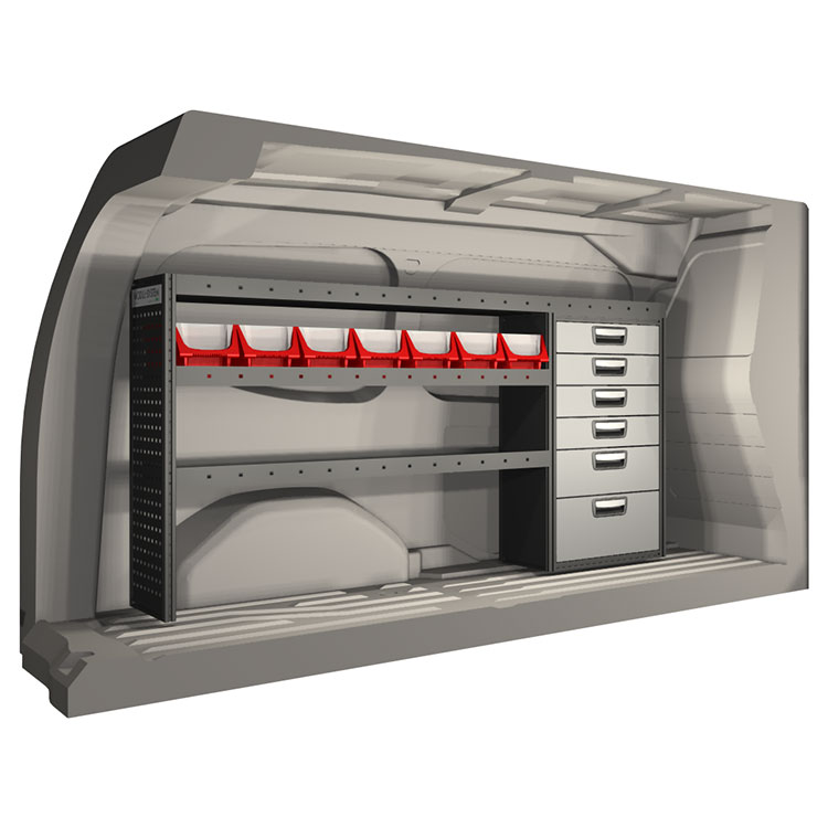 The racking has been specially designed to ensure the optimum fit to the vehicle, as well as the best possible functionality and safety. It has been developed for professional use, is flexible and is intended for service jobs in various types of business. All shelves are equipped with rubber mats, and all drawers with foam plastic liners. Assembly material is included.