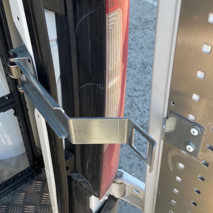 The door stop hinges are developed to prevent the rear doors from slamming when in an open position. The rear doors can easily be unhinged if there is a need to have the doors fully opened.