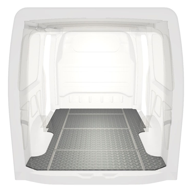 Lightweight and robust van floor with transverse rails for a Mercedes Sprinter with anti-slip aluminum tread plate and cargo rails (longitudinal and transverse) for quick and safe installation of racking systems and other accessories.
