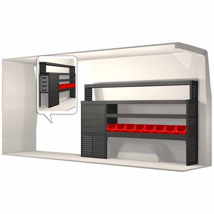 The racking has been specially designed to ensure the optimum fit to the vehicle, as well as the best possible functionality and safety. It has been developed for professional use, is flexible and is intended for service jobs in various types of business. All shelves are equipped with rubber mats, and all drawers with foam plastic liners. Assembly material is included.