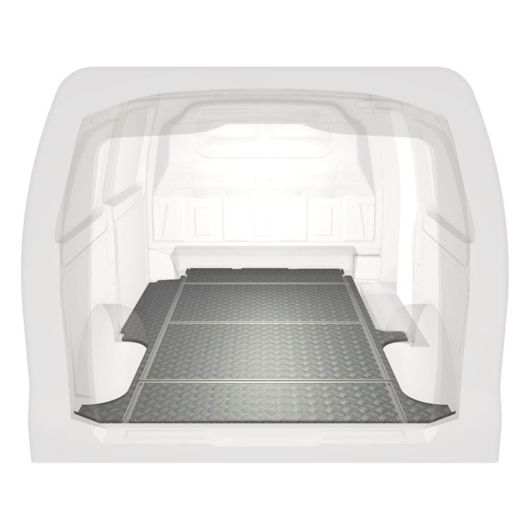 Lightweight and robust van floor with transverse rails for a Mercedes Vito with anti-slip aluminum tread plate and cargo rails (longitudinal and transverse) for quick and safe installation of racking systems and other accessories.