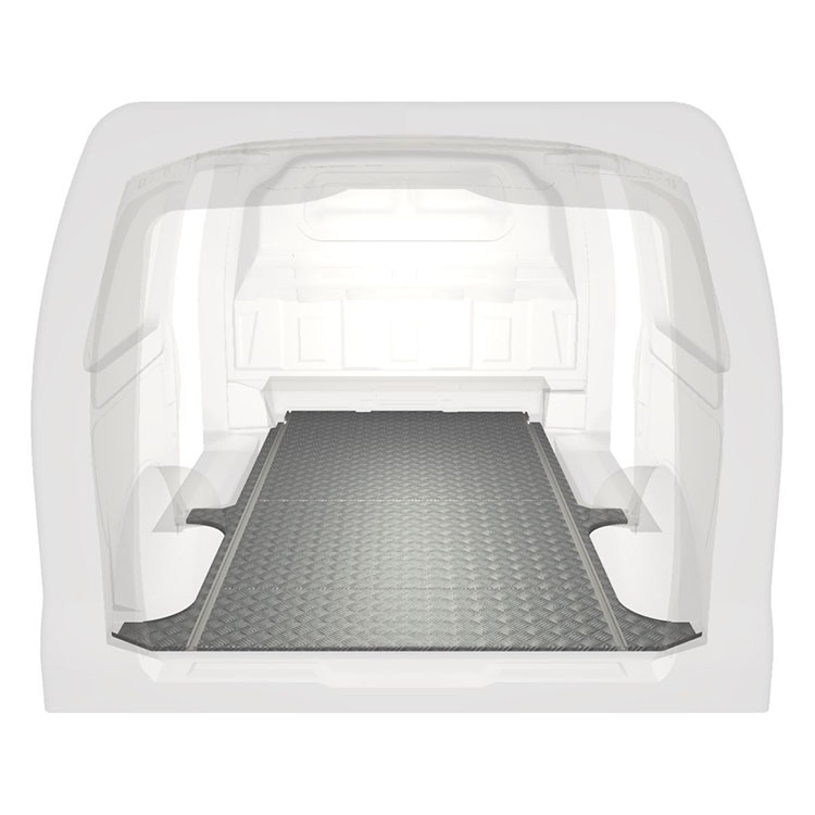 Lightweight and robust standard van floor for a Mercedes Vito with anti-slip aluminum tread plate and cargo rails (longitudinal) for quick and safe installation of racking systems and other accessories.