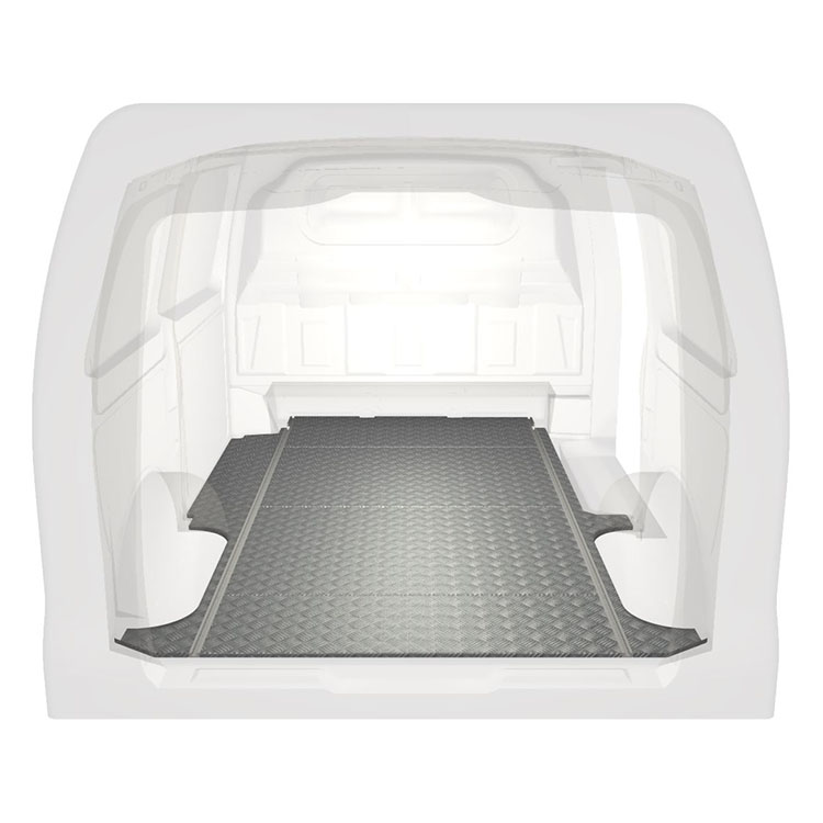 Lightweight and robust standard van floor for a Mercedes Vito with anti-slip aluminum tread plate and cargo rails (longitudinal) for quick and safe installation of racking systems and other accessories.