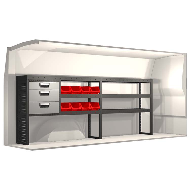 The racking has been specially designed to ensure the optimum fit to the vehicle, as well as the best possible functionality and safety. It has been developed for professional use, is flexible and is intended for service jobs in various types of business. All shelves are equipped with rubber mats, and all drawers with foam plastic liners. Assembly material is included.