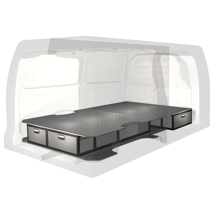 The kit is designed to be fitted on top of a Modul-Floor, utilizing the floor rails for a non-intrusive installation. The double floor is equipped with rails for easy installation of vehicle racking, and edging strips for a nice finish.