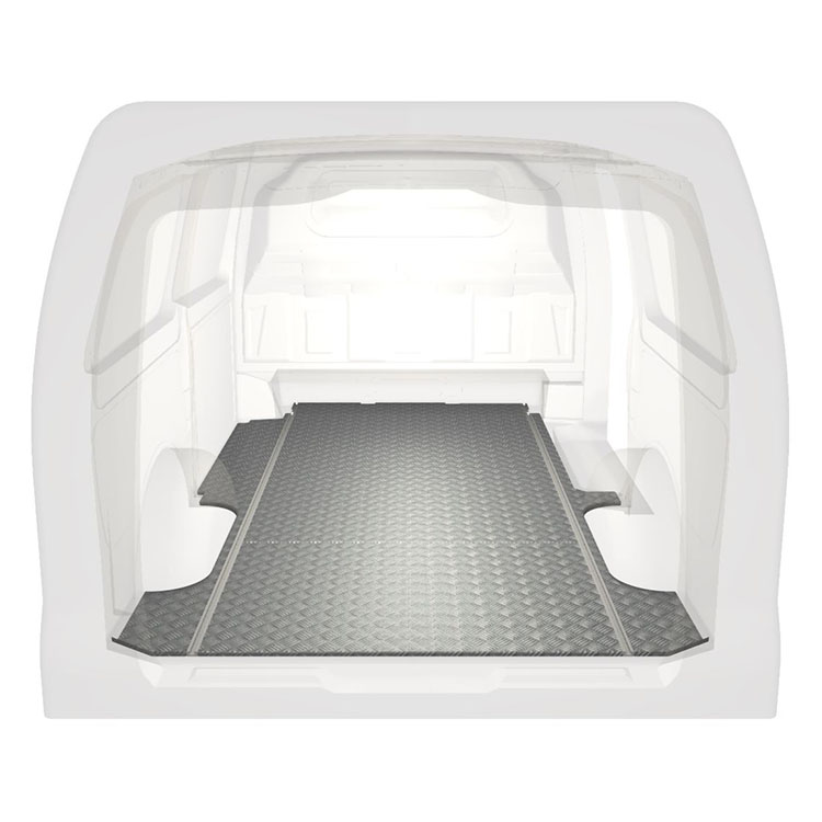 Lightweight and robust standard van floor for a Mercedes Vito with anti-slip aluminum tread plate and cargo rails (longitudinal) for quick and safe installation of racking systems and other accessories.
