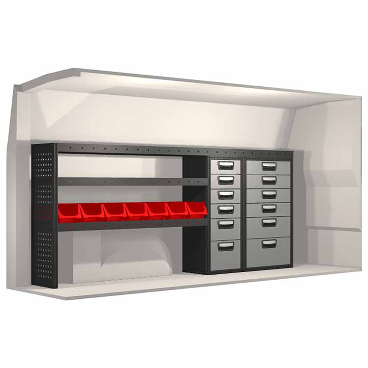 The racking has been specially designed to ensure the optimum fit to the vehicle, as well as the best possible functionality and safety. It has been developed for professional use, is flexible and is intended for service jobs in various types of business. All shelves are equipped with rubber mats, and all drawers with foam plastic liners. Assembly material is included.