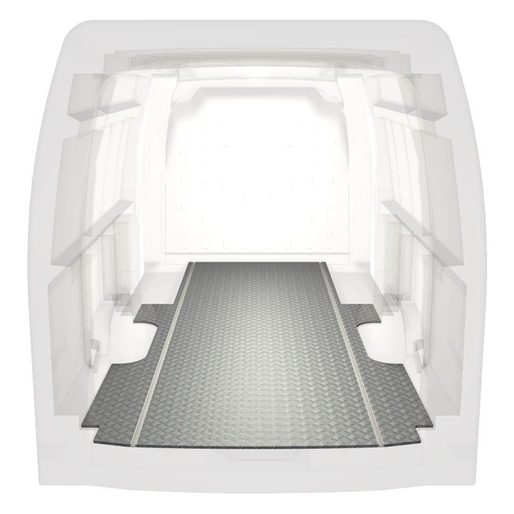 Lightweight and robust extra long floor for a Renault Master / Opel Movano / Nissan NV400 with anti-slip aluminum tread plate and cargo rails (longitudinal) for quick and safe installation of racking systems and other accessories.