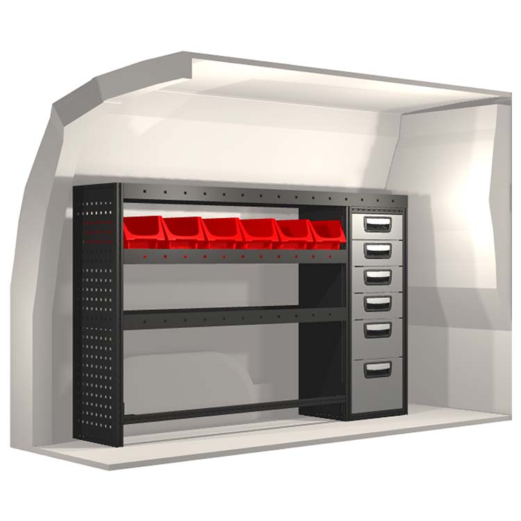 The racking has been specially designed to ensure the optimum fit to the vehicle, as well as the best possible functionality and safety. It has been developed for professional use, is flexible and is intended for service jobs in various types of business. All shelves are equipped with rubber mats, and all drawers with foam plastic liners. Assembly material is included.