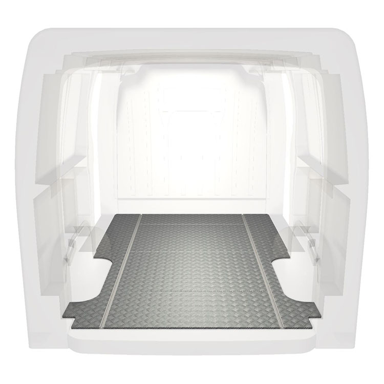Lightweight and robust standard van floor for a Renault Master / Opel Movano / Nissan NV400 with anti-slip aluminum tread plate and cargo rails (longitudinal) for quick and safe installation of racking systems and other accessories.