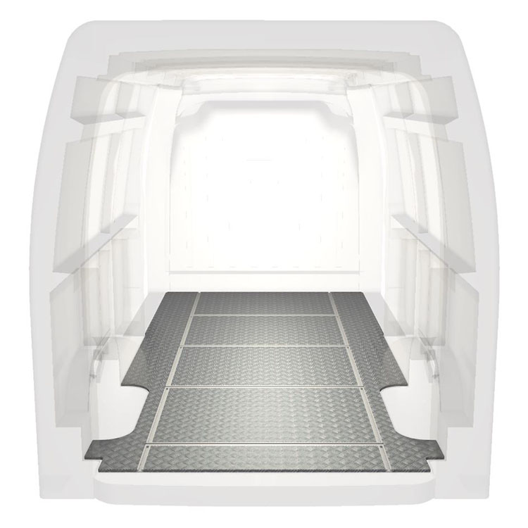 Lightweight and robust van floor with transverse rails for a Renault Master / Opel Movano / Nissan NV400 with anti-slip aluminum tread plate and cargo rails (longitudinal and transverse) for quick and safe installation of racking systems and other accessories.