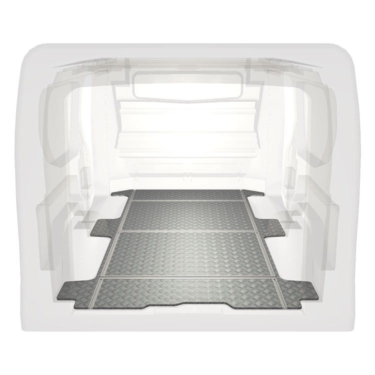 Lightweight and robust van floor with transverse rails for a Renault Trafic / Opel Vivaro / Fiat Talento / Nissan NV300 with anti-slip aluminum tread plate and cargo rails (longitudinal and transverse) for quick and safe installation of racking systems and other accessories.