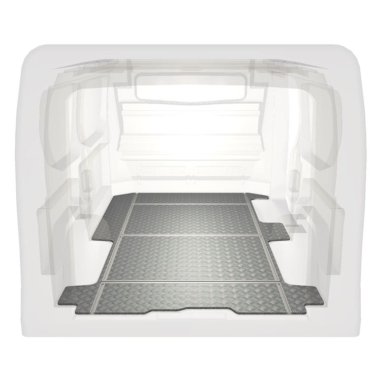 Lightweight and robust van floor with transverse rails for a Renault Trafic / Opel Vivaro / Fiat Talento / Nissan NV300 with anti-slip aluminum tread plate and cargo rails (longitudinal and transverse) for quick and safe installation of racking systems and other accessories.