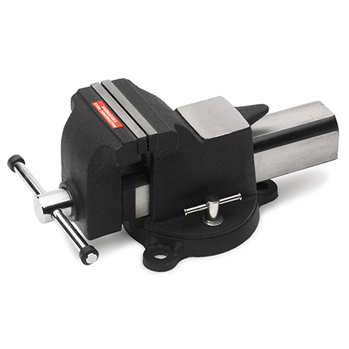 Cast steel vice with a jaw width of 100 mm. The vice has an integrated swivel base and built-in jaws for pipes.