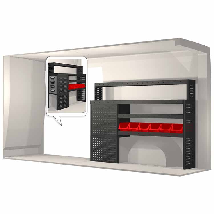 The racking has been specially designed to ensure the optimum fit to the vehicle, as well as the best possible functionality and safety. It has been developed for professional use, is flexible and is intended for service jobs in various types of business. All shelves are equipped with rubber mats, and all drawers with foam plastic liners. Assembly material is included.