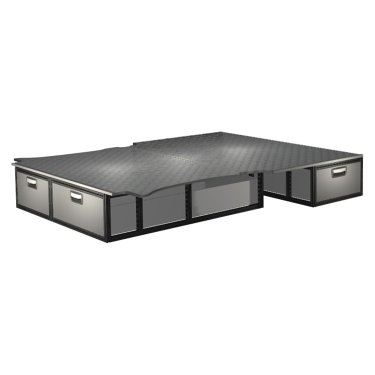 The kit is designed to be fitted on top of a Modul-Floor, utilizing the floor rails for a non-intrusive installation. The double floor is equipped with rails for easy installation of vehicle racking, and edging strips for a nice finish.