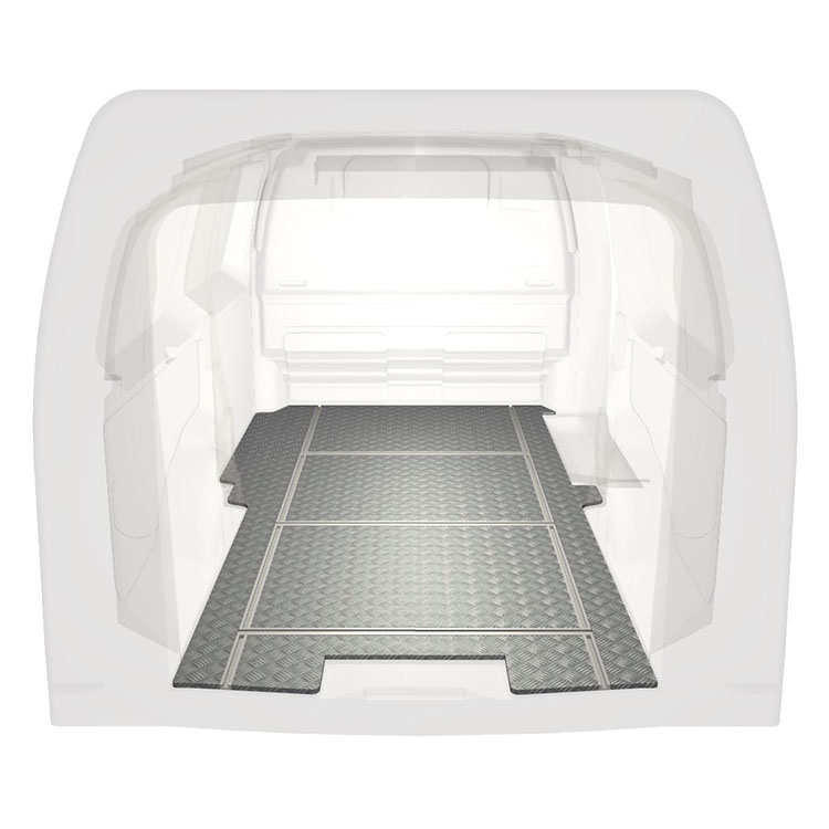Lightweight and robust van floor with transverse rails for a Citroën Jumpy / Peugeot Expert / Toyota ProAce with anti-slip aluminum tread plate and cargo rails (longitudinal and transverse) for quick and safe installation of racking systems and other accessories.