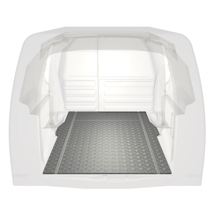Lightweight and robust standard van floor for a Citroën Berlingo / Peugeot Partner with anti-slip aluminum tread plate and cargo rails (longitudinal) for quick and safe installation of racking systems and other accessories.