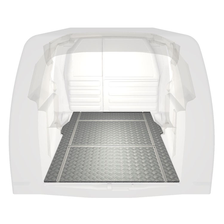 Lightweight and robust van floor with transverse rails for a Citroën Berlingo / Peugeot Partner with anti-slip aluminum tread plate and cargo rails (longitudinal and transverse) for quick and safe installation of racking systems and other accessories.