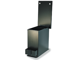 Folding lid/table top with storage unit beneath. Complete with pen holder and two bottle holders. The lid/table top is covered with grey felt.