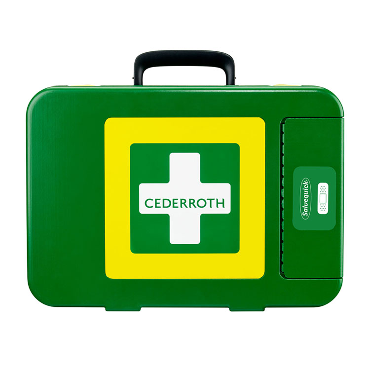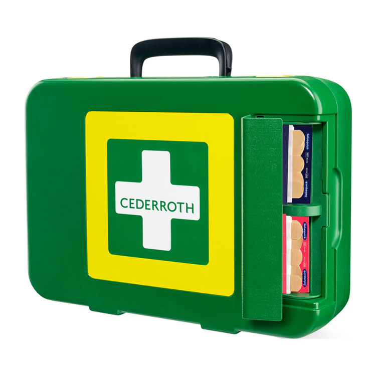 A large, well-stocked First Aid Kit made from hard plastic to keep dust, moisture and dirt at bay, even in tough environments. Having the plaster dispenser on the outside makes it easy to remove a plaster, without touching any of the other products in the kit, keeping them hygienically clean.