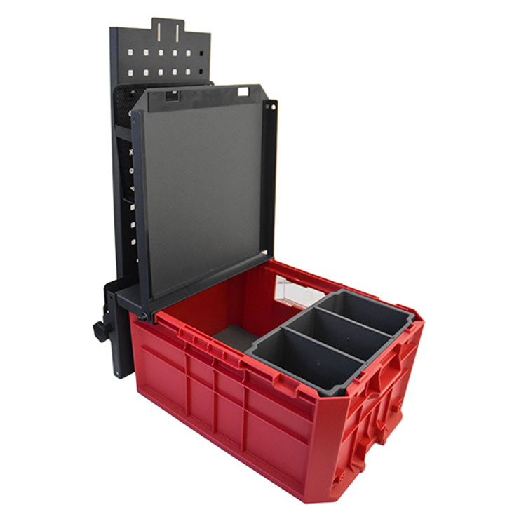 Mobile Office has a large storage space and a lid with anti-slip surface. A plastic liner for the base, an insert for smaller equipment, a magnet to hold papers and a storage pocket is included.
