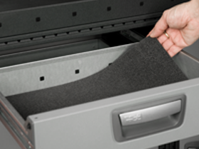 Sound- and impact-absorbent foam plastic liner for drawers storing fragile tools, spare parts, etc. Thickness 5 mm. Supplied individually.